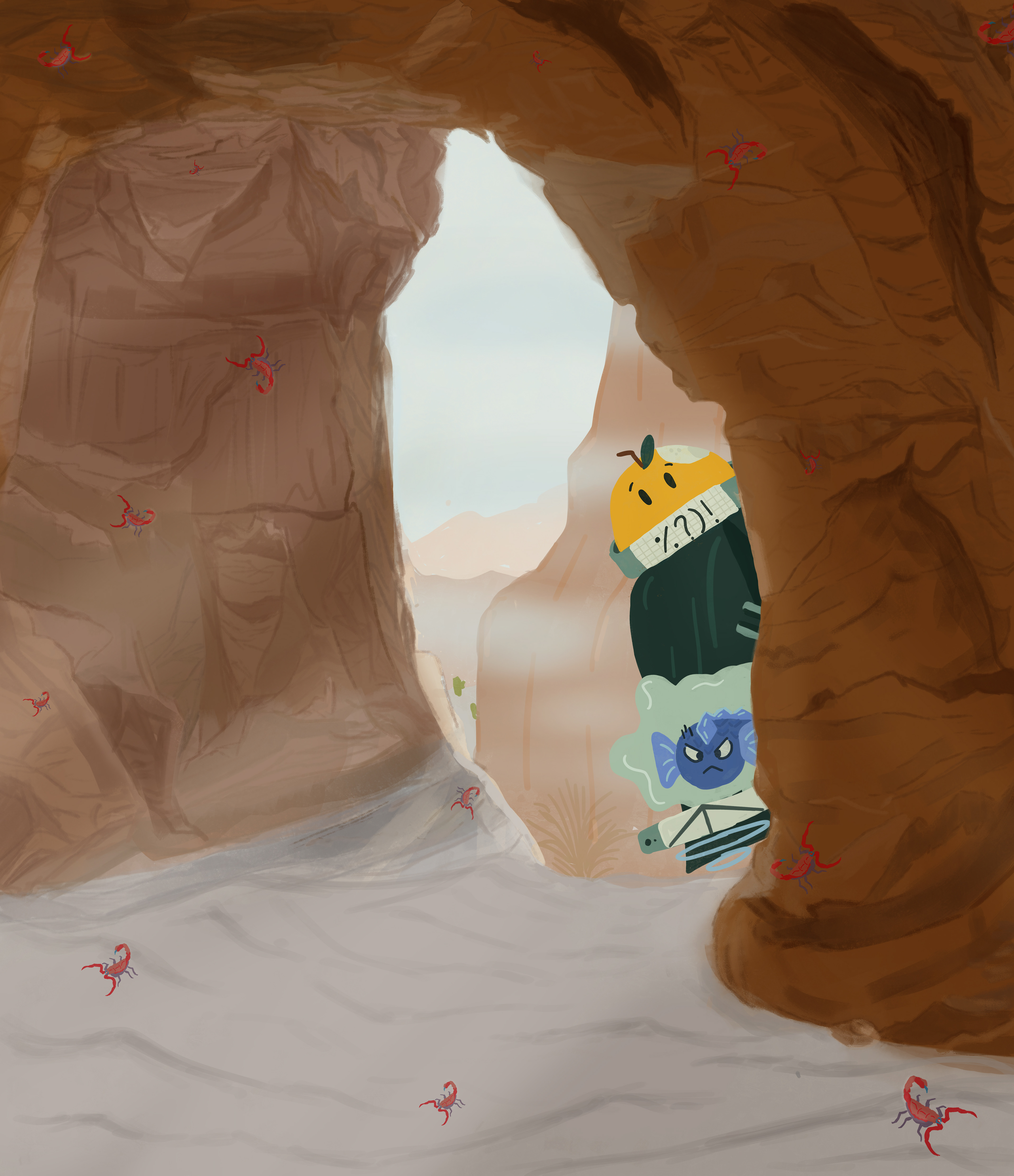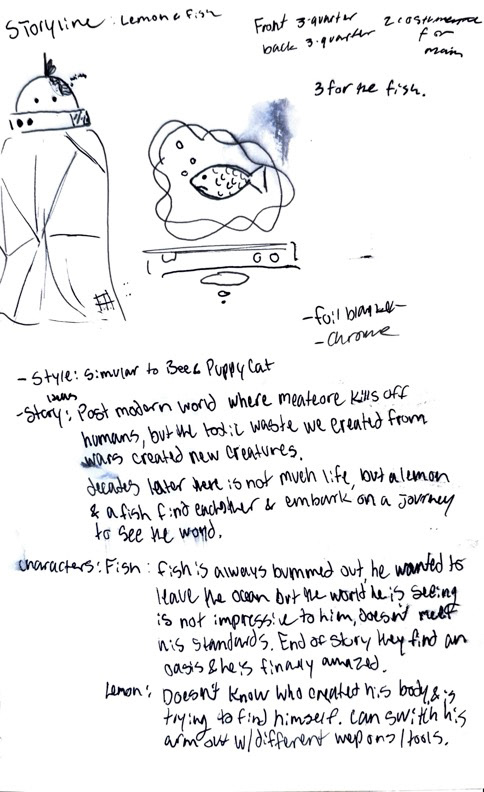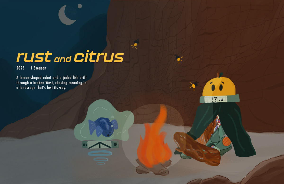 Rust and Citrus is a concept I created for a show. The plot follows a half-robot, half-lemon tree on a journey to find its creator. He is joined by a fish friend who wants to see the world; however, he is mostly unimpressed and even scared of what he has seen so far. On their journey, they discover new places, fight monsters, and explore a once lively but now deserted world.